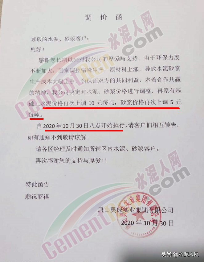 同期,河北唐山奥成实业集团通知,由于环保力度不断加大,国家调控错峰生产,原材料上涨,导致水泥砂浆生产成本大幅上涨,为保证双方的共同利益,本着合作共赢的精神,唐山奥成实业集团公司决定自2020年10月30日八点开始对水泥、砂浆价格进行调整,在原有基础上水泥价格再次