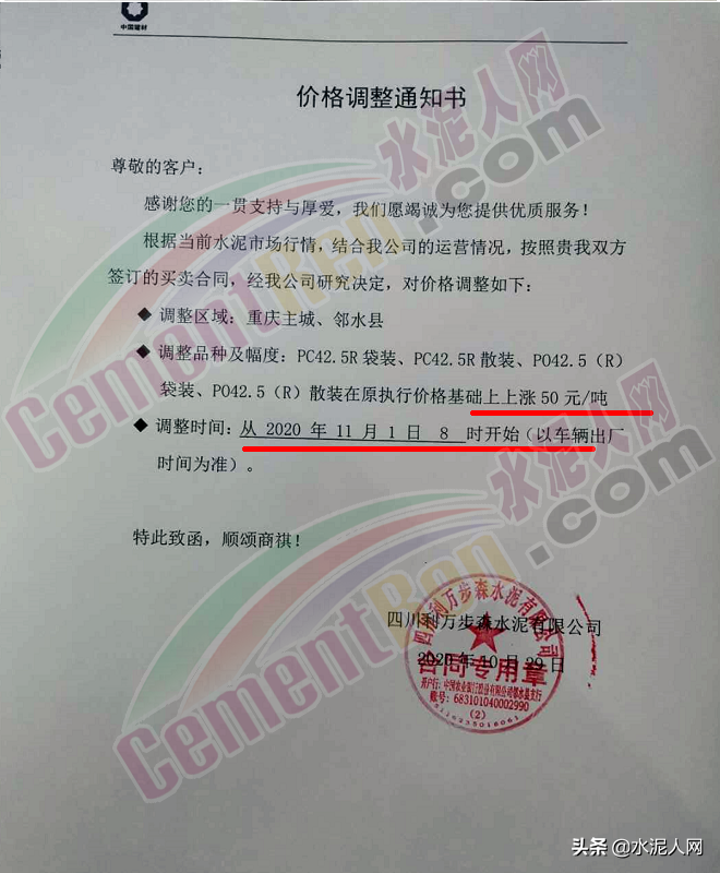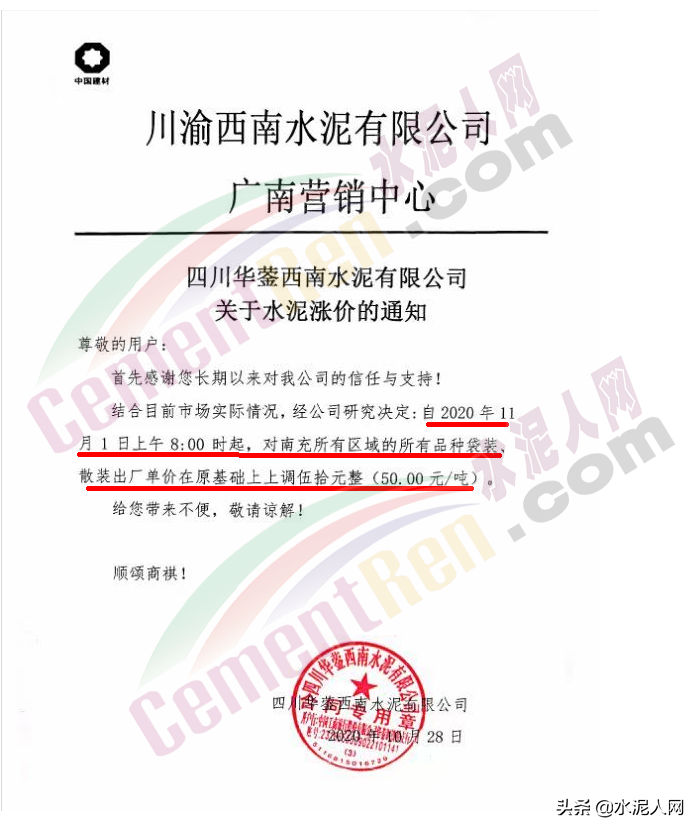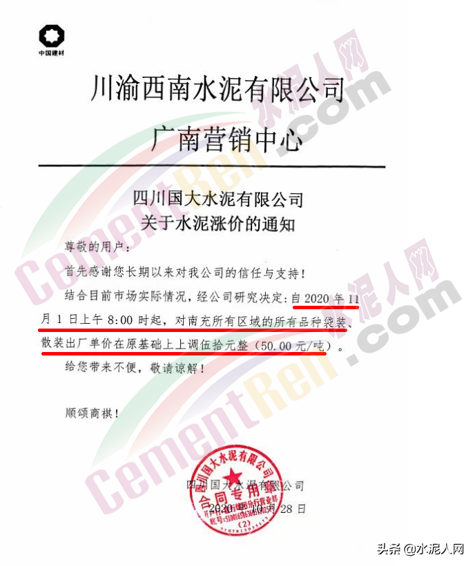 四川四大水泥发布通知称:11月1日上午8时起,对南充所有区域的所有品种袋装、散装出厂价在原基础上
