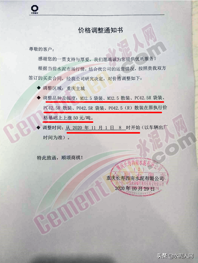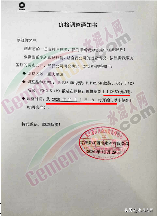 重庆綦江西南水泥发布通知称:自11月1日8时起,重庆主城M32.5袋装、M32.5散装、PC42.5R袋装、PC42.5R散装、PO42.5R袋装、PO42.5散装