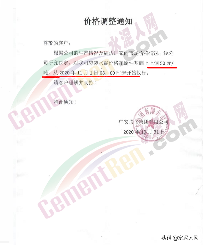 广安腾飞集团发布通知称,自11月1日8时起,对广安腾飞袋装水泥价格在原价基础上