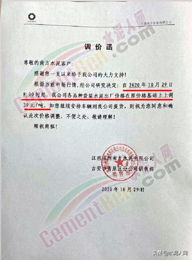 据水泥人网了解,江西吉州南方水泥吉安市青原区分公司销售部根据当前市场行情,经公司研究决定,自2020年10月29日8时起,各品种袋装水泥出厂价格在原价格基础上