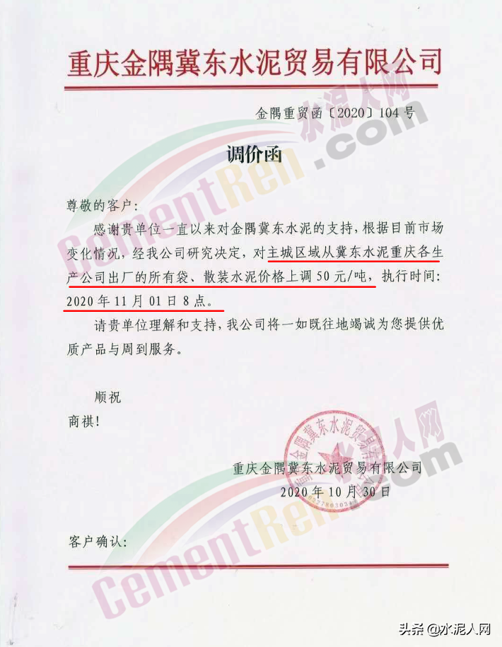 自11月1日8时起,对主城区域从冀东水泥重庆各生产公司出厂的所有袋、散装水泥价格上调50元/吨。