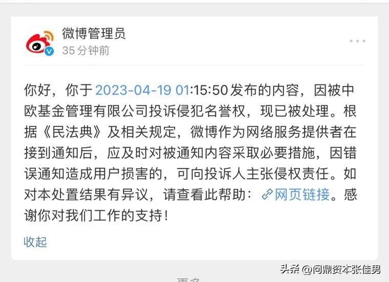 结果今天我就发了一条类似还帮她“辟谣”的内容,居然收到了中欧基金的投诉,说我侵犯了名誉权?卧槽!你们给基金持有人亏了多少钱?你们这干了些啥?亏得稀里哗啦,就没事了?处理什么名誉权倒是挺快啊!那么多人在中欧基金里面找你们要说法,要解释,你们装作看不见?怎么?觉得散户和基金持有人没流量?钱少瞧不起?所以你们不管不顾,我站出来说两句你们就给我把《民法典》搬出来了?