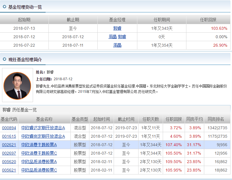 中欧消费郭睿:金融学学士,该基金任期近4年,现管理4支基金,收益率都超过了同类平均。