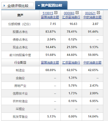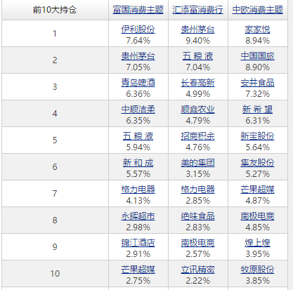前十股集中度:中欧消费最高达59.90%,最低汇添富消费44.60。