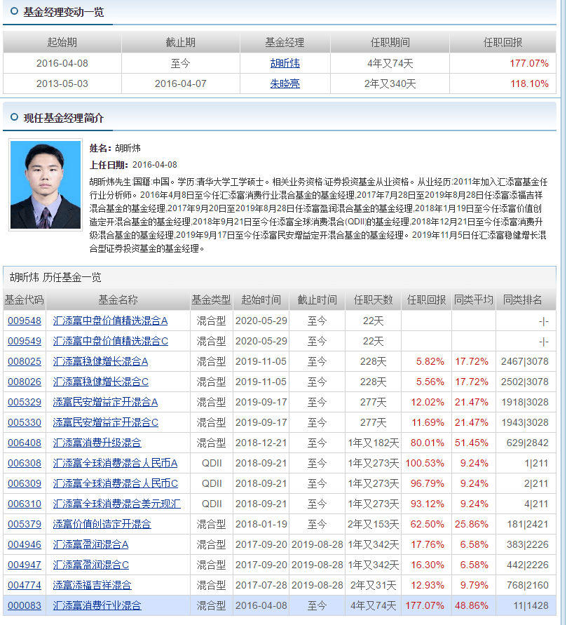 汇添富消费胡昕炜:清华大学工学硕士,该基金任期4年多,现管理11支基金,各类类型风格的基金都有,收益率有高有低。