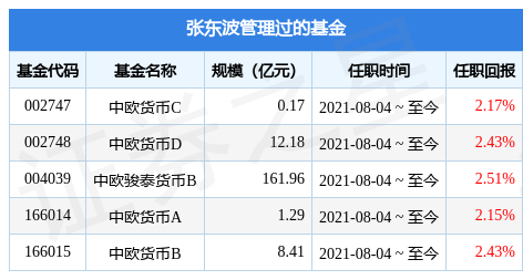 【推荐】中欧滚钱宝货币基金经理变动增聘张东波为基金经理001211基金