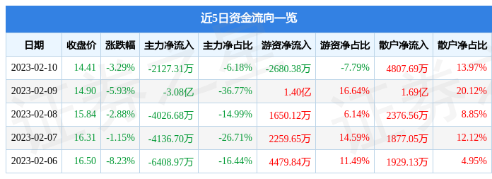 2月10日的资金流向数据方面,主力资金净流出2127.31万元,占总成交额6.18%,游资资金净流出2680.38万元,占总成交额7.79%,散户资金净流入4807.69万元,占总成交额13.97%。