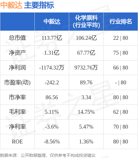 中毅达2023一季报显示,公司主营收入3.26亿元,同比下降5.03%;归母净利润-1174.32万元,同比下降165.27%;扣非净利润-1200.39万元,同比下降170.91%;负债率89.4%,财务费用1127.9万元,毛利率5.11%。中毅达(600610)主营业务:精细化工产品的生产与销售。。