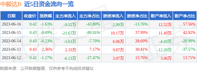 截至2023年6月16日收盘,中毅达B(900906)报收于0.42元,下跌1.63%,换手率0.14%,成交量5110.0手,成交额21.74万元。