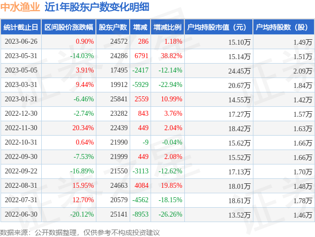 近日中水渔业披露,截至2023年6月26日公司股东户数为2.46万户,较5月31日增加286.0户,增幅为1.18%。户均持股数量由上期的1.51万股减少至1.49万股,户均持股市值为15.1万元。