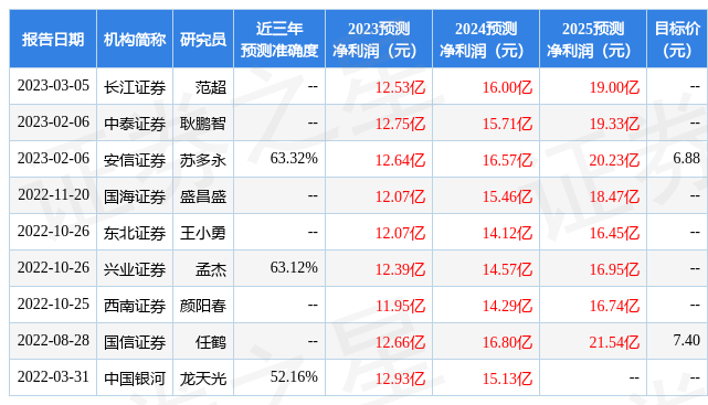证券之星数据中心根据近三年发布的研报数据计算,安信证券苏多永研究员团队对该股研究较为深入,近三年预测准确度均值为63.32%,其预测2023年度归属净利润为盈利12.64亿,根据现价换算的预测PE为7.43。