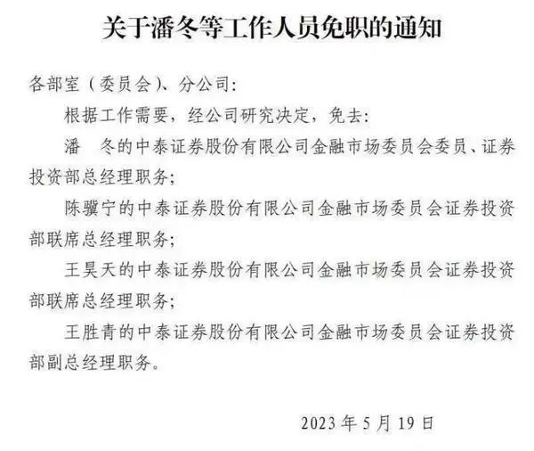 根据网传的一份中泰证券5月19日最新下发的人事任免文件显示,中泰证券免去金融市场委员会四位负责人职务。