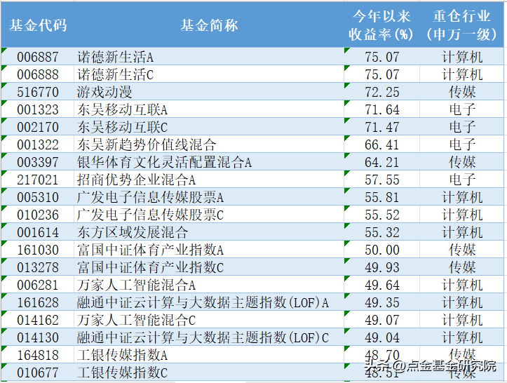 基金市场也呈现出了明显分化,今年收益居前的基金多为重仓TMT板块相关的基金,重仓大消费和之前关注度较高的新能源相关的基金表现相对较差。