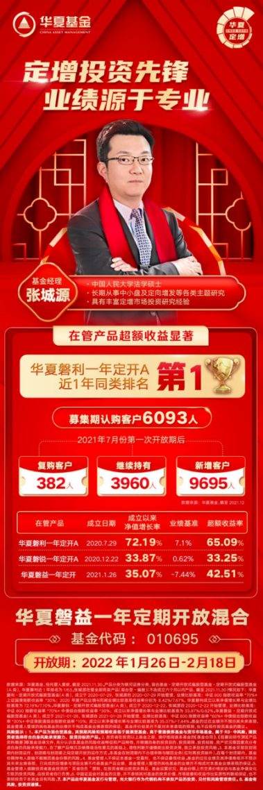 风险提示 :1、本基金为混合型基金,其长期平均风险与预期收益高于债券基金、货币基金,低于股票基金,属于中风险(R3)品种,具体风险评级结果以基金管理人和销售机构提供的评级结果为准。2、本基金以一年定期开放方式运作,采取在封闭期内封闭运作、封闭期与封闭期之间定期开放的运作方式。本基金在封闭期内不办理申购与赎回业务(红利再投资除外)。在每个封闭期内,基金份额持有人面临不能赎回基金份额的风险。若基金份额持有人错过某一开放期而未能赎回,其份额需至下一开放期方可赎回。本基金投资定增股票需要锁定六个月,可能存在锁定期内无法及时调整组合、锁定期结束后无法立刻卖出股票的风险。3、本基金股票投资策略包括定向增发投资策略,定向增发股票投资价格可能不同于股票二级市场交易价格,可能会产生一定的折价或溢价。4、本基金可投资于资产支持证券,可能面临的风险包括流动性风险、证券提前赎回风险、再投资风险和SPV违约风险等。具体内容详见本招募说明书“风险揭示”章节。5、基金管理人可依据市场实际情况和风险控制的要求,来调整实际定增仓位比例。6、本基金可投资港股通标的股票,需承担港股通机制下因投资环境、投资标的、市场制度以及交易规则等差异带来的特有风险。可投资港股通标的的基金可根据投资策略需要或不同配置地市场环境的变化,选择将部分基金资产投资于港股或选择不将基金资产投资于港股,基金资产并非必然投资港股。7、投资者在投资本基金之前,请仔细阅读本基金的《基金合同》、《招募说明书》和《产品资料概要》等基金法律文件,充分认识本基金的风险收益特征和产品特性,并根据自身的投资目的、投资期限、投资经验、资产状况等因素充分考虑自身的风险承受能力,在了解产品情况及销售适当性意见的基础上,理性判断并谨慎做出投资决策,独立承担投资风险。8、已完成的定增参与项目业绩不代表基金产品业绩。基金管理人不保证本基金一定盈利,也不保证最低收益。本基金的过往业绩及其净值高低并不预示其未来业绩表现,基金管理人管理的其他基金的业绩并不构成对本基金业绩表现的保证。9.基金管理人提醒投资者基金投资的“买者自负”原则,在投资者做出投资决策后,基金运营状况、基金份额上市交易价格波动与基金净值变化引致的投资风险,由投资者自行负责。10.中国证监会对本基金的注册,并不表明其对本基金的投资价值、市场前景和收益作出实质性判断或保证,也不表明投资于本基金没有风险。11.本产品由华夏基金发行与管理,代销机构不承担产品的投资、兑付和风险管理责任。12.本资料不作为任何法律文件,观点仅供参考,资料中的所有信息或所表达意见不构成投资、法律、会计或税务的最终操作建议,我公司不就资料中的内容对最终操作建议做出任何担保。在任何情况下,本公司不对任何人因使用本资料中的任何内容所引致的任何损失负任何责任。市场有风险,投资需谨慎。