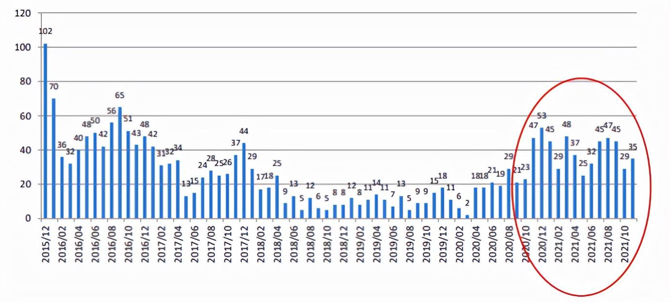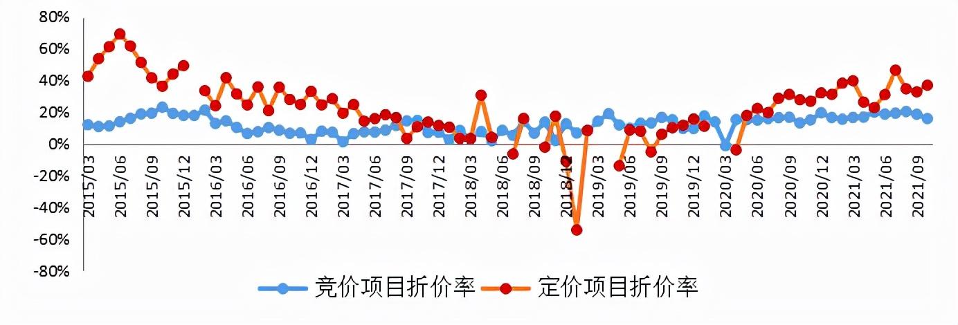 咱们之前聊过,定向增发就是指上市公司采用非公开方式向特定对象发行股票的行为,而定增股票一般都会有折扣率和锁定期,在锁定期内持股待涨,因此买入价的折扣高低也决定了后续盈利情况。而从数据来看,截止2021年11月末,过去12个月国内定增项目平均折价率为21.4%,比上一年度上升5.3个百分点。