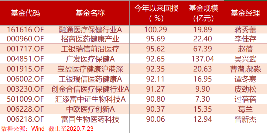 2020年同样是一个基金的丰收年,股票型、偏股混合型、平衡混合型基金均有不俗表现。据WIND数据,截至7月23日,融通医疗保健行业A(161616.OF)今年以来收益已经超100%,成为目前年内唯一一只收益率超100%的基金。