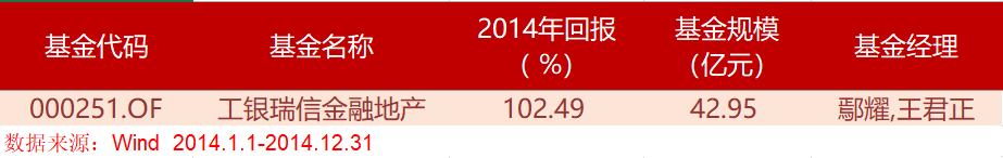 而再往前推一年,2014年市场风格迥然不同。2014年上半年市场表现不温不火,下半年权重股异军突起,金融、地产、基建类股票连续大涨,带动上证指数从2000多点直接奔向3400点。当年收益破100%的基金仅有工银瑞信金融地产一家,年内收益102%。顾名思义,这只基金只投向与金融和地产行业的公司,因而成为了当年股票型基金中的收益状元。
