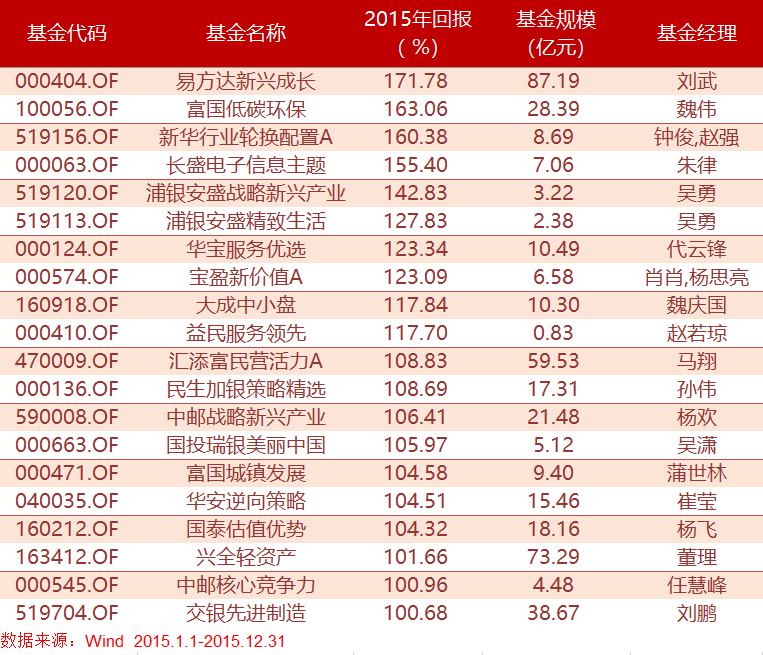 而2015年A股大起大落,在剧烈震荡的行情下,全年共有20只基金收益破百,是最近十年以来,年内“收益破百”基金家数最多的一年。易方达新兴成长(000404.OF)当年收益率为171%拔得头筹,富国低碳环保(100056.OF)、新华行业轮换配置A、长盛电子信息(000063.OF)主题、浦银安盛战略新兴产业(519120.OF)紧随其后,分列2-5位。这些基金当年的持仓有一个共同特点,就是重仓中小创股票。2015年大牛市创业板指触及了4000点的历史高点,是当年基金收益爆表的最大原因。