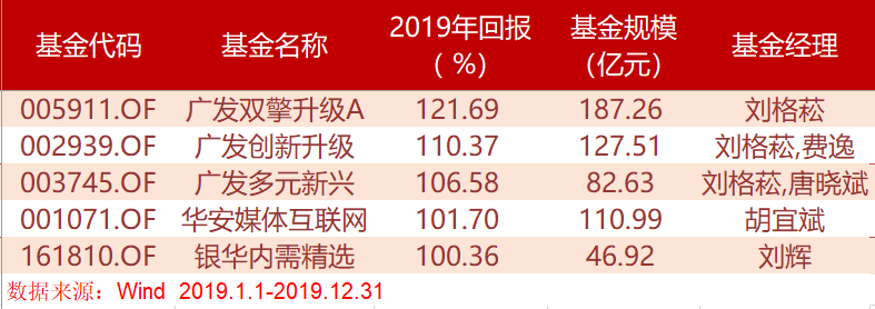根据WIND数据统计显示,从2010年开始的十年,仅在2014、2015和2019年出现了全年收益破100%的基金。其中去年有五支基金收益破百,其中广发的明星基金经理刘格菘占据了其中三席。其中收益最高的广发双擎升级(005911.OF)年内实现了121%的收益。分析这些基金的年内持仓,主要分布在了芯片、消费电子、新能源上游和农业等板块,而这些板块在2019年均有过较大的上涨行情,给这些基金带来了较大的净值贡献。