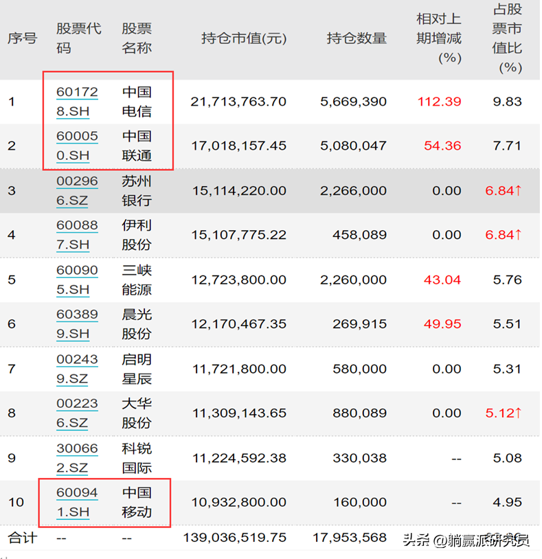 从去年三季度末(实际上增持应该发生在9月末之前),到今年一季度末,中国电信涨幅58%,中国联通涨幅65%,中国移动涨幅32%。