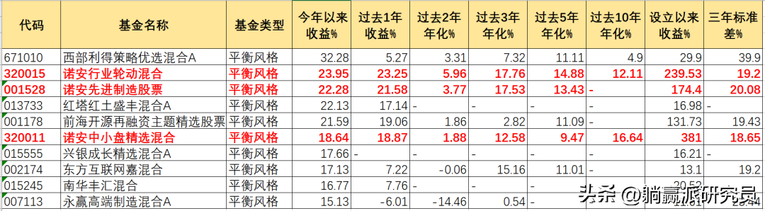 基金细分类别,晨星的数据非常好用,分类主要按照基金实际持仓来归类。根据晨星的数据,在平衡风格类别里,今年以来收益最高的10只基金,收益率都达到了两位数。