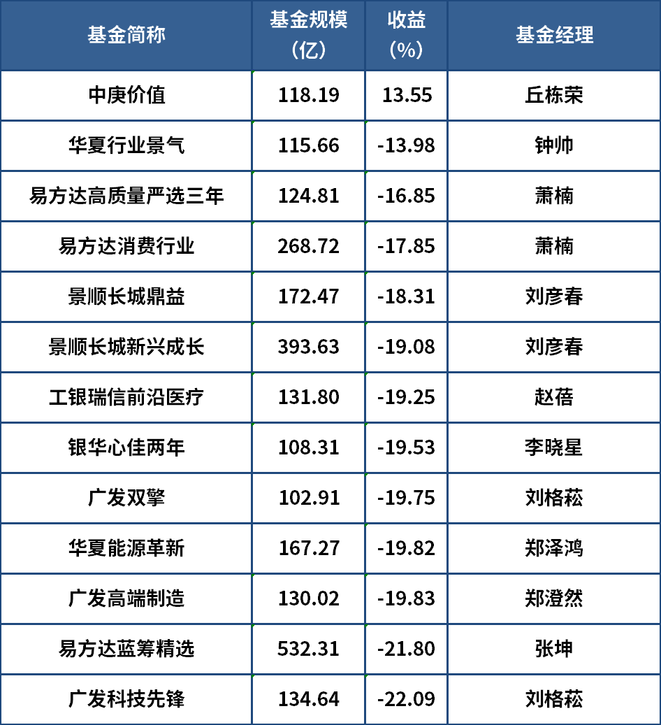 结果风水轮流转,今年轮到坤坤兰兰们亏惨了。在超过百亿规模的基金中,今年只有丘栋荣是正收益,其余均亏10%以上,春春、蓓蓓、坤坤亏损在20%左右,兰兰、谢大百亏损25%,最惨的是蔡蔡,亏损36%,排名倒数第一。