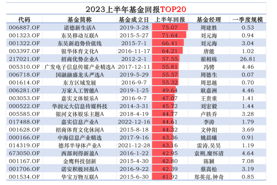 2023上半年表现较好的基金,基本上都是主投传媒、人工智能、电子科技和计算机的。