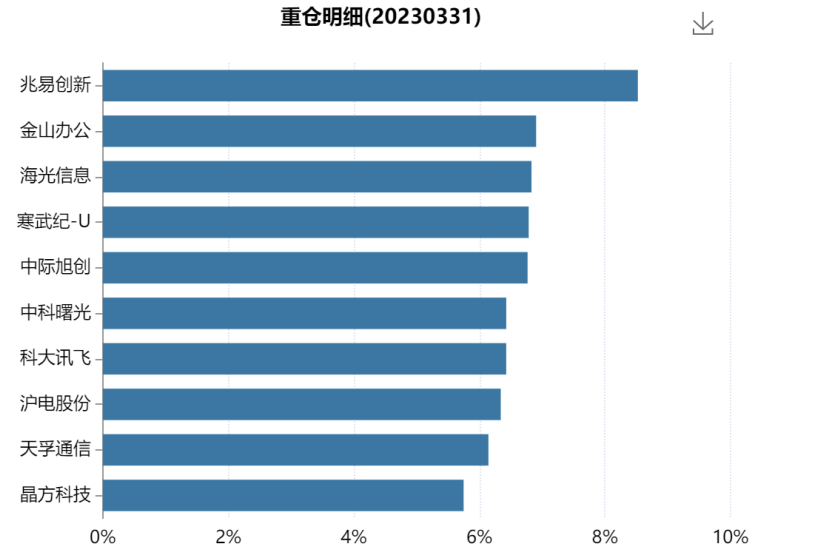 从一季度持仓来看,比如兆易创新、海光信息、寒武纪-U和晶方科技都是半导体公司,中际旭创和天孚通信都是通信设备行业,中科曙光和科大讯飞都是做计算机设备相关的。