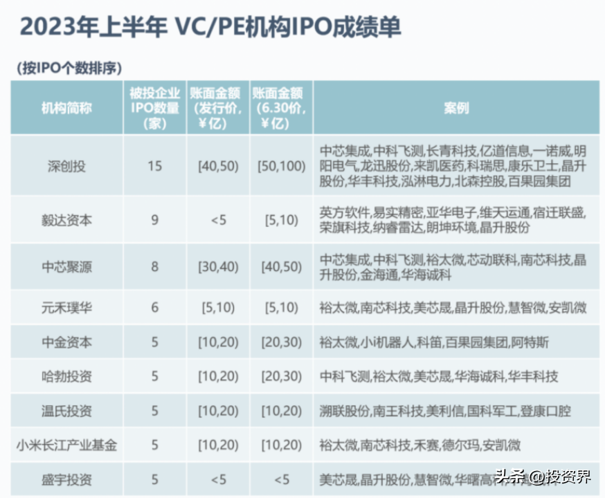 我们先看一份IPO成绩单——清科研究中心统计显示,2023上半年共有9家VC/PE机构收获5个及以上IPO,令人意外的是出现了4家产业资本,分别是中芯聚源、哈勃投资、温氏投资、小米长江产业基金。