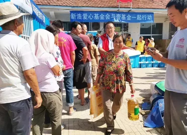 8月18 日上午,纪台镇丁家尧河村委大院内人头攒动,壹基金和潍坊市鸢都义工等公益组织的22名工作人员和志愿者正在发放爱心物资。几百位村 民在村委大院内排起长队,有序领取。据了解,村民们领取的是由壹基金为丁家尧河村捐助的 302 份爱心物资,总价值 14.8 万元, 这其中有150 个家庭救灾箱是深圳市新浩爱心基金会特别为丁家尧河村民捐助的。