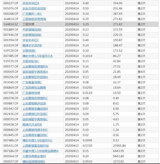 从金额来看,鹏华前海最为慷慨,每10份基金份额分红79.12元。鹏华前海(每10份分红79.12元),城投ETF(每10份分红7.5元)位列二、三位。南方成份精选A派现手笔最大,分红总额为14.76亿元,中银证券安进A(分红11.99亿元),中银瑞福浮动净值型C(分红11.42亿元),景顺长城新兴成长(分红9.34亿元),建信恒远一年定开(分红8.32亿元)分红总额排名居前。