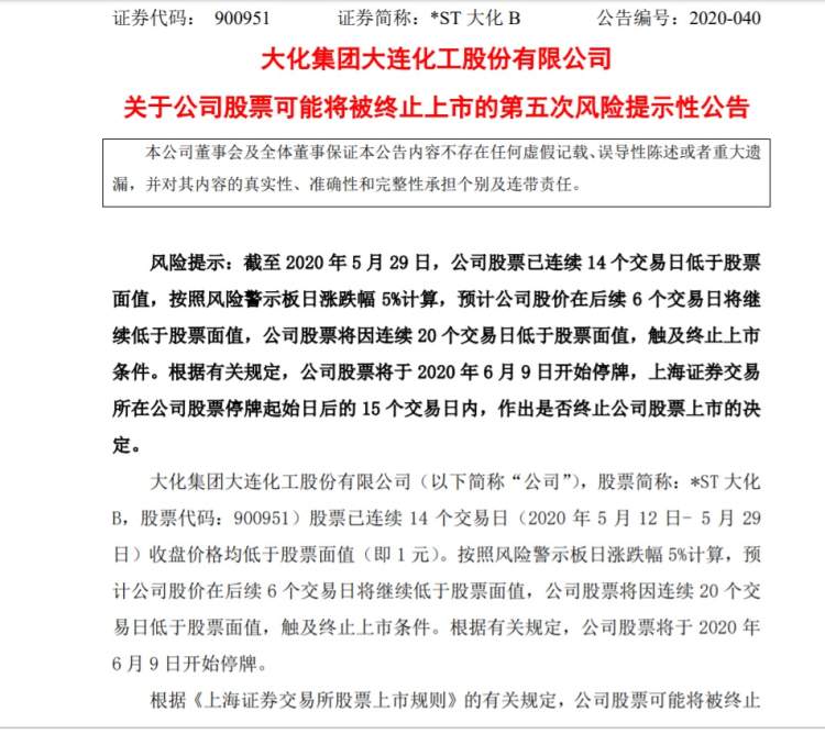5月29日盘后,该公司披露,截至2020 年 5月29 日,公司股票已连续14个交易日低于股票面值,按照风险警示板日涨跌幅5%计算,预计公司股价在后续6个交易日将继续低于股票面值,公司股票将因连续20个交易日低于股票面值,触及终止上市条件。根据有关规定,公司股票将于2020年6月9日开始停牌,上海证券交易所在公司股票停牌起始日后的15个交易日内,作出是否终止公司股票上市的决定。