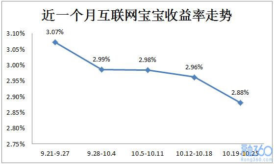 融360监测的数据显示,本周(10月19日-10月25日)74只互联网宝宝产品的平均七日年化收益率为2.88%,较上周下降了0.08个百分点,连续16周下跌,再创年内新低,同时也创下2017年1月以来的最低收益水平。